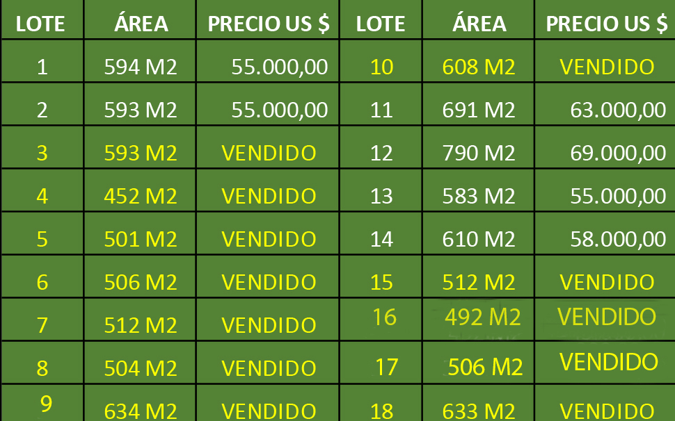Más del 75 % de las obras están terminadas. 12 lotes ya vendidos. Quedan pocos lotes disponibles. Aproveche esta oportunidad antes de que los precios suban conforme se terminen las obras. Fácil acceso: